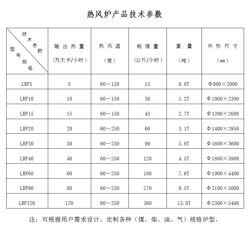 注:可根据用户需求设计、定制各种(煤、柴、油、气)规格炉型。