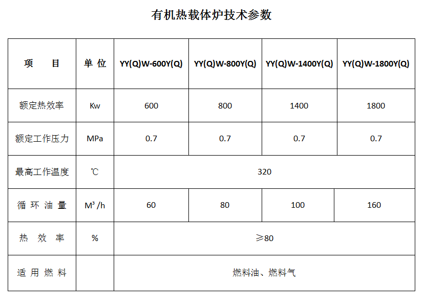 有机热载体炉性能特点及技术参数: 有机热载体锅炉是以油、气为燃料,以导热油为介质,利用循环油泵强制导热油进行液相循环的新型加热设备。工作压力低至0.6MPa时,可获取温度液